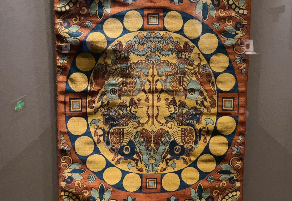 红地联珠团窠四骑士狩猎纹锦(唐 复制)