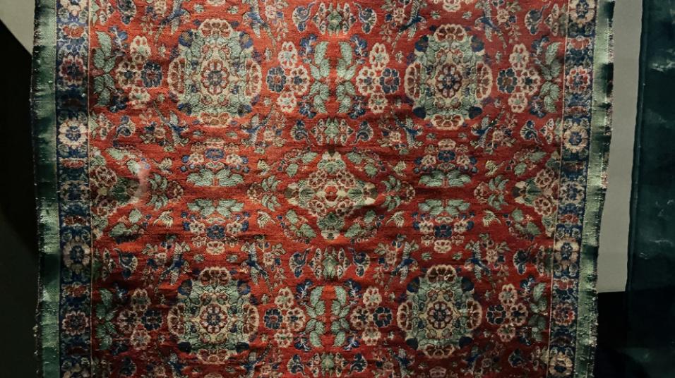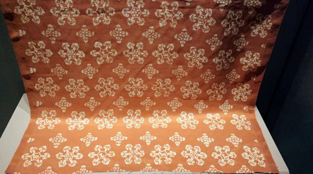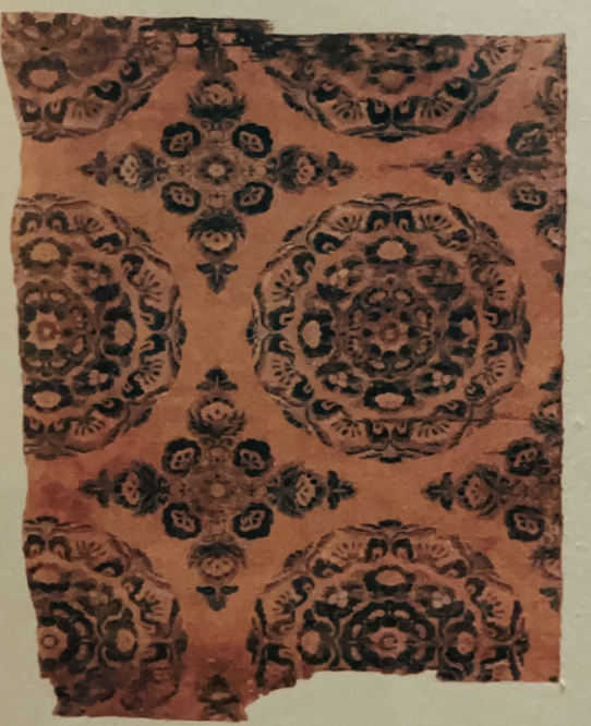 红地瑞花印花绢(唐 复制)原件出土于新疆吐鲁番阿斯塔那