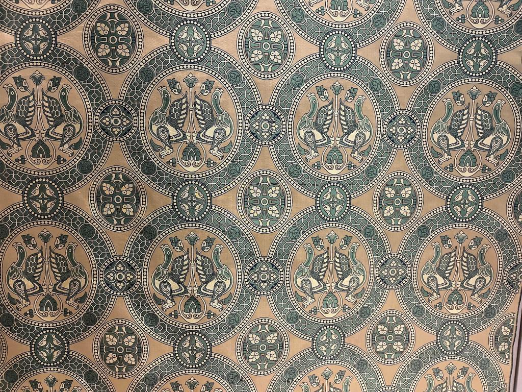 1956年在新疆与青海交界处阿拉尔出土,现藏于北京故宫博物院。由钱小萍主持设计复制,纹样主体为复式小联珠环组成的大团窠纹,以生命树为中轴、根都以葡萄纹、树的两侧为相背引颈而立的神乡一灵觉,有灵魂不朽的寓意。织锦华图典雅,充满异域风情。
