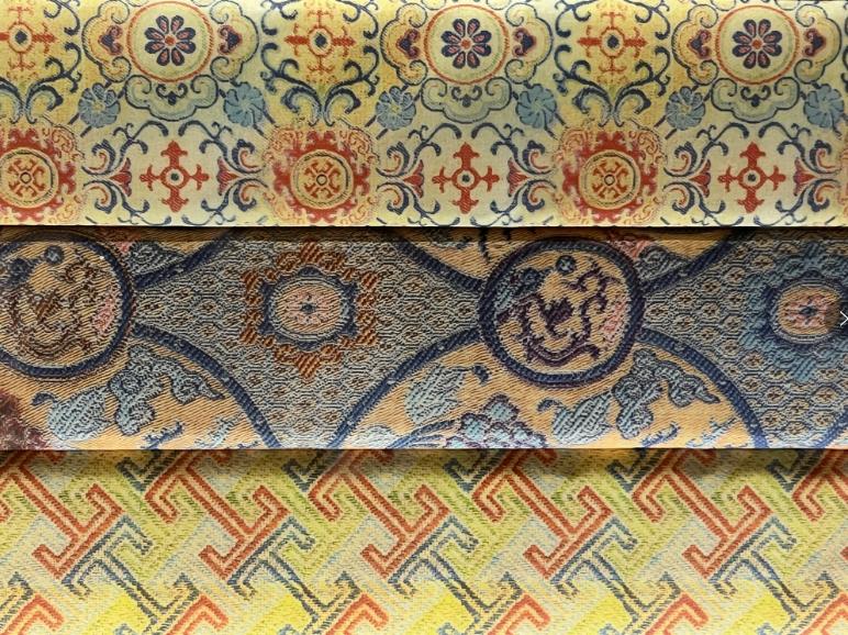 黄地花蕾纹锦残片+黄地花树对凤纹锦残片(汉)