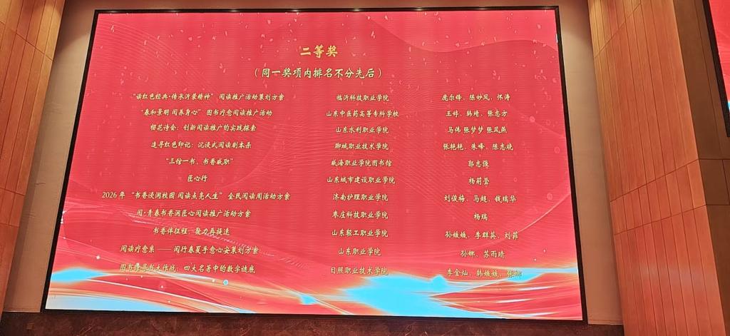——策划方案喜获殊荣:由我校图书馆提交的《书香伴征程,聚力再提速》阅读推广活动策划方案,荣获2026年山东省高职院校阅读推广活动策划方案征集二等奖,体现了我校在阅读推广工作中的创新思路与扎实实践。